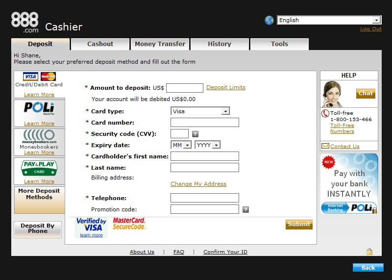 Теперь перейдем ко второму варианту – ставкам на деньги. У игроков есть возможность вносить депозит в евро и долларах. Пока остается невозможным играть онлайн в 888 Покер на рубли. Для внесения средств на игровой счет предусмотрены самые популярные платежные системы:
