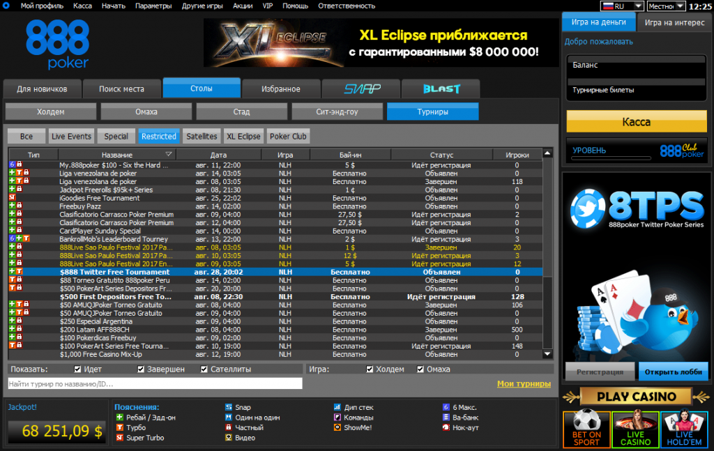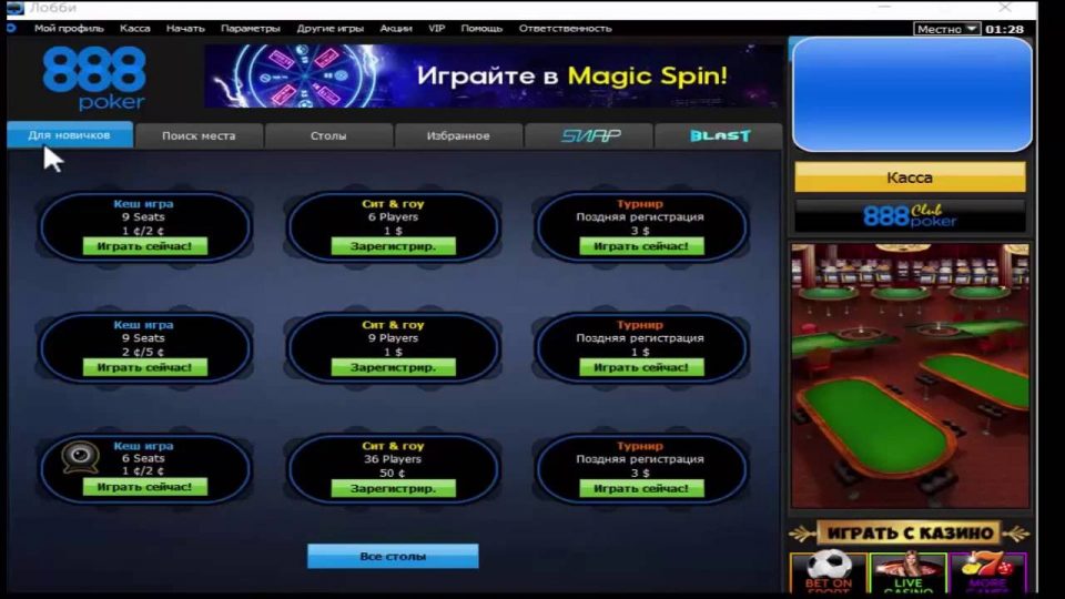 Скачать 888poker на компьютер стоит и всем любителям бетинга и ставок в казино. В этом приложении доступны вкладки для перехода в БК и игорный дом восьмерок. Используя уже существующий аккаунт, сможете заключать пари на самые популярные виды спорта и делать ставки в: