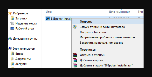 Теперь перейдите в папку «Загрузки» (Download) и найдите в ней файл 888poker_installer. Нажмите два раза по этому файлу или кликните по нему правой кнопкой мыши, в открывшейся вкладке выберите пункт «Открыть»: