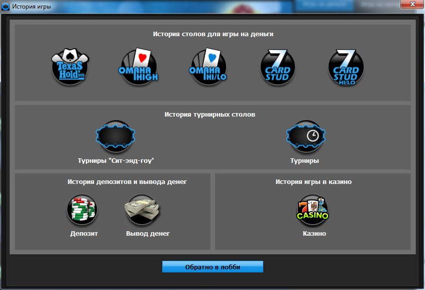 В этом разделе представлена вся история вашей игры в этой комнате. Здесь вы сможете получить доступ по истории игры за кеш-столами по Омахе, Холдему и Стаду, в турнирах, онлайн-казино 888. В этой же вкладке доступны сведения по внесенным депозитам и кеш-аутам.