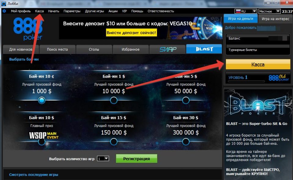 Отдельно следует выделить раздел Касса на 888Poker. Он является ключевым. Перейти в Кассу можно несколькими способами. Так, вы можете нажать на соответствующую кнопку в главном лобби клиента или выбрать данную вкладку вверху слева: