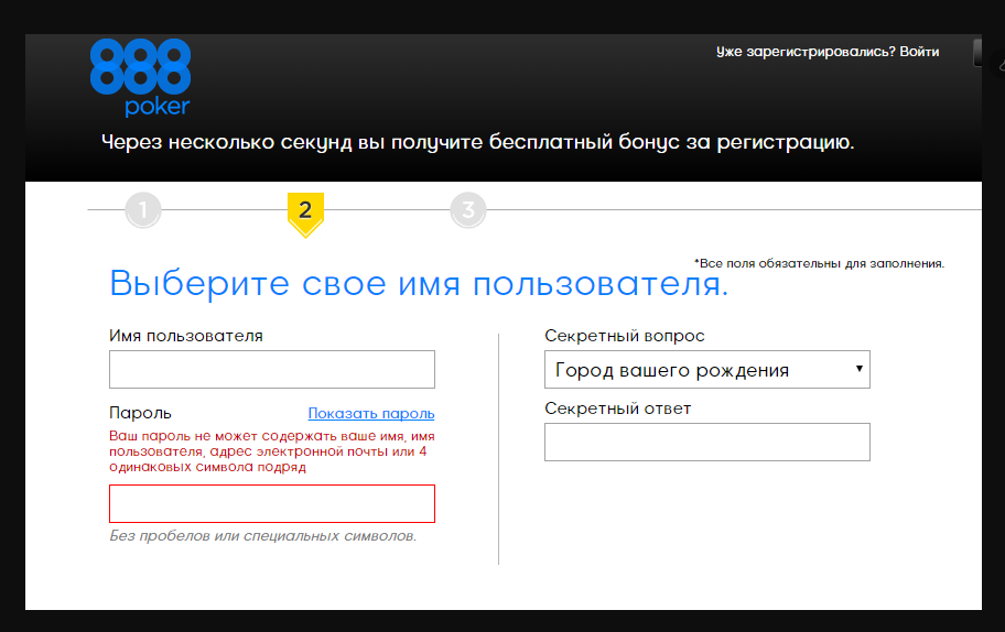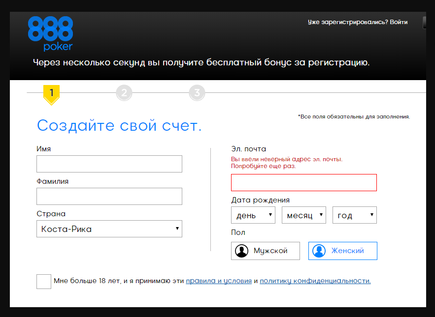 Шаг №1: Регистрация в 888Poker доступна на официальном сайте. Чтобы перейти на него, нажмите внизу этой статьи на соответствующую кнопку. На открывшейся странице кликните на «Зарегистрироваться».