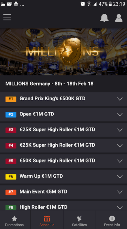 - MILLIONS Grand Final Barcelona – крупномасштабное событие, где на кону стоит 10 000 000 евро. Оно начнется 7 апреля и будет проходить в Casino Barcelona. Игроки смогут попасть на такое мероприятие благодаря отборочным турнирам, где бай-ины к ним стартует $0.50. В ходе них будет разыграно 10 путевок на Grand Final, стоимость каждой из которых составляет $16 000.