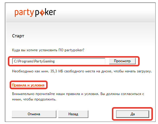 Шаг №2: Теперь выберите папку, куда будут загружены файлы и обновления программного обеспечения. По умолчанию это диск С, папка Programs. На нем должно быть не менее 35.3 свободного пространства. Сразу же потребуется ознакомиться с правилами и условиями игры в руме и согласиться с ними: