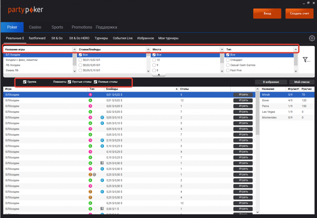 Когда деньги внесены на счет, то вы можете сразу приступить к ставкам в покер. Для быстрого поиска нужных игр в клиенте предусмотрена система фильтров: