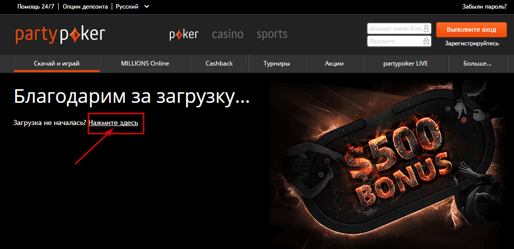 В конце этой статьи есть кнопка «Перейти на официальный сайт». Нажмите на нее, а потом на открывшейся странице кликните на «Перейти на PartyPoker». Вы будете перенаправлены на альтернативную версию сайта этой онлайн-комнаты.