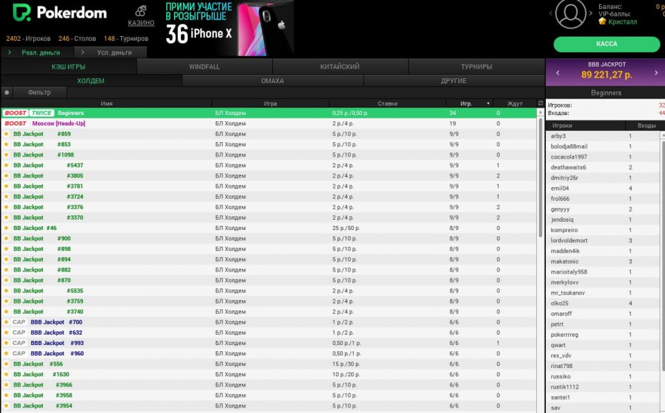 - пользователь получает доступ ко всем играм, присутствующим в румам: кеш-столы, турниры, сит-энд-гоу, ивенты формата Windfall.