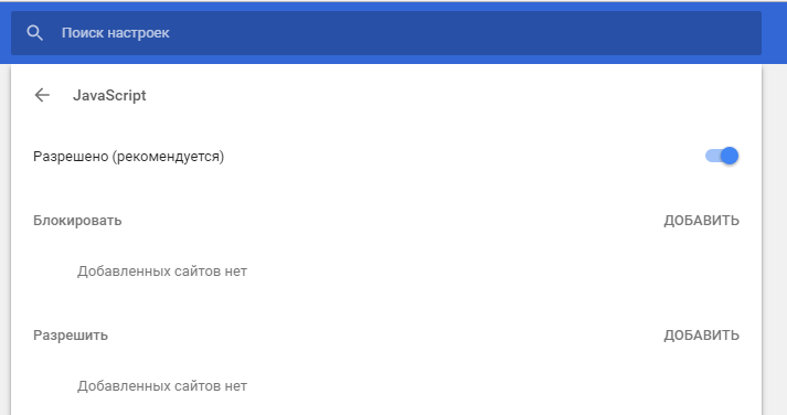 Теперь выберите в настройках веб-браузера кнопку «JavaScript». Активируйте пункт «Разрешено». Также добавьте адрес сайта и зеркала PokerDom в список разрешенных. Данный пункт доступен прямо в этой же вкладке, чуть ниже: