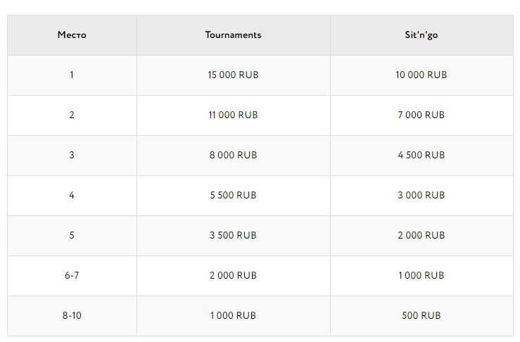 Все участники акции будут получать PlayPoint за генерирование рейка. По количеству баллов будут сформированы рейтинги для каждого дивизиона. Между их лидерами будут распределены призовые фонды в соответствии с этими таблицами: