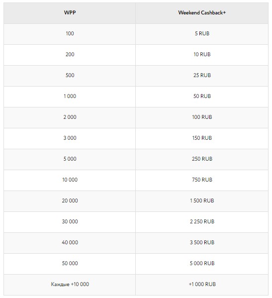 Отыгрывая раздачи и принимая участие в турнирах с 15:00 пятницы до конца воскресенья, вы будете получать очки Weekend Play Points из расчета 1 рубль рейка = 1 WPP. Они будут давать право на дополнительный кешбек, который будет начисляться согласно этой таблице: