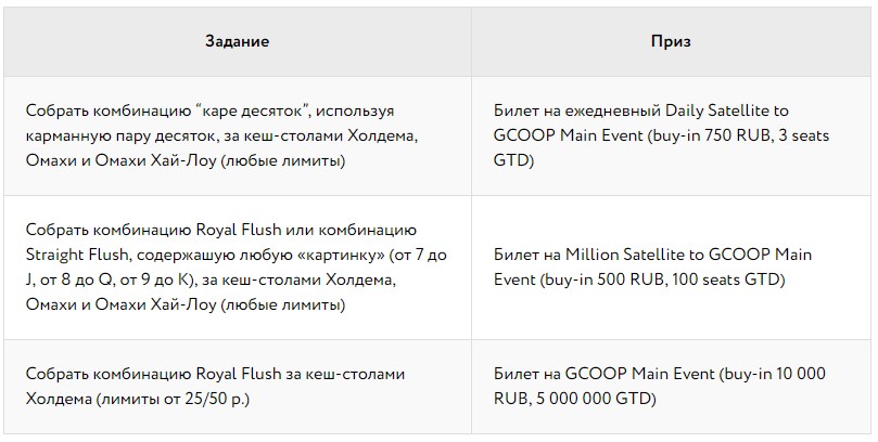 Турнирные билеты начисляются игрокам автоматически, как только выполнено задание. При этом покеристу нет необходимости доходить до шоудауна, чтобы получить тикет – достаточно получить в раздаче одну из указанных комбинаций.